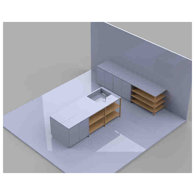 この意匠に係る内装は、例えば住居やオフィス等の部屋に設けられるものであり、対面型のシステムキッチンと、カウンター付きの収納家具を備えている。
