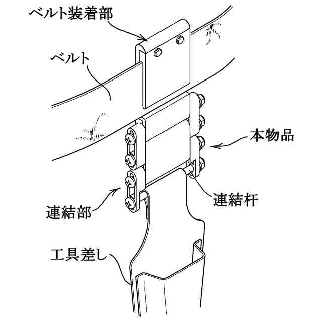 本物品は、参考正面図及び使用状態を示す参考図に図示したように、ベルト装着部と、工具差し等を吊り下げ連結する連結杆を設けた連結部とからなる腰ベルト用金具である。本物品は、金属製であり、巾約8cm,高さ約15cm,奥行き約1cmである。