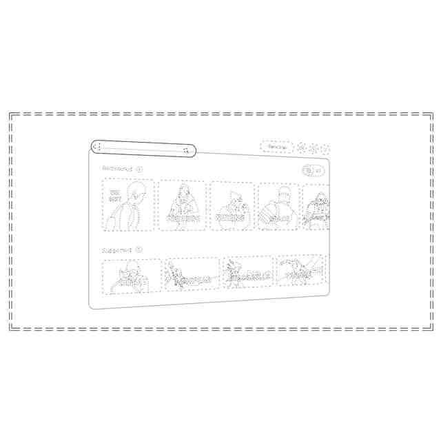 実線で表された部分が、意匠登録を受けようとする部分である。「画像図」及び「変化後の画像図1~3」は、検索バーの連続する変化を示している。具体的には、ユーザーが横長トラック型の検索バーの一部をタップ、クリック、またはタッチすると、検索バーの下の矩形状のパネル部が向きを変えながら徐々にぼやけて、ユーザーから遠ざかるように見える変化をしつつ、検索バー自体は画面の中央に移動して、ユーザーに近づくように見える変化をするものである。