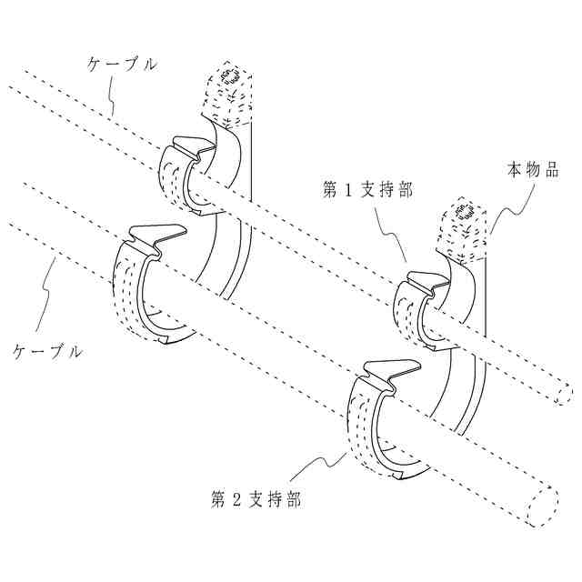 本物品は、壁面や柱などに固定されてケーブルや電線管などの配線・配管材を支持する配線・配管材支持具に関するものである。使用状態参考図により説明すると、本物品は、第1支持部と、その下側に当該第1支持部よりも大径の第2支持部と、が形成され、それぞれにケーブルを載置して支持することができる。