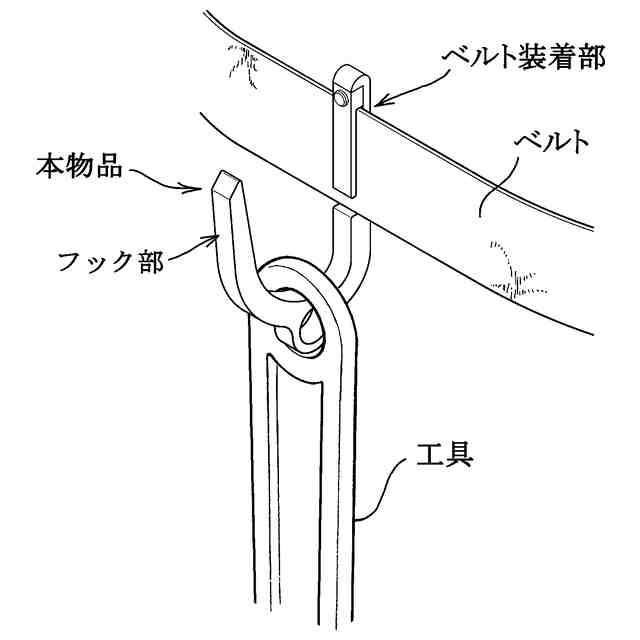本物品は、使用状態を示す参考図1,使用状態を示す参考図2に図示したように、ベルト装着部と、工具等を吊り下げ連結するフック部とからなる腰ベルト用金具である。フック部に設けた孔部は、カラビナ等を吊り下げ連結するためのものである。本物品は、金属製であり、巾約8cm,高さ約12cm,厚さ約1cmである。