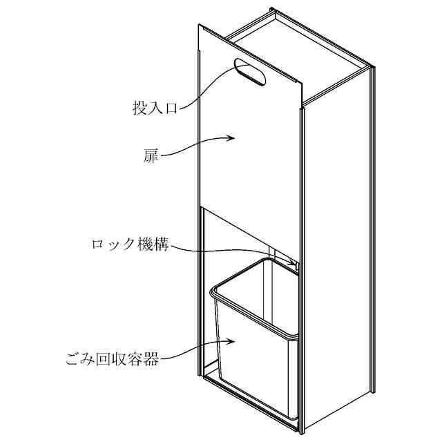 本物品は、正面側に設けられた扉を上方にスライド移動させて当該扉を開いた状態にすることができるごみ箱である。扉にはごみ等を投入するための投入口が設けられている。扉が開いた状態において、内部に配置されたごみ回収容器の出し入れが可能である。本物品には、扉が開いた状態を維持するロック機構が設けられており、開いた状態にある扉の落下が防止される。