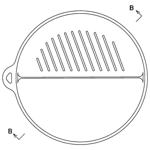 本物品は、食材を加熱調理するために使用するフライパンである。本物品は、開口縁の一部に隅丸の三角形に形成されてなる係止穴を備えてなる。また、フライパン本体の底面には底面を2分割する仕切りが設けられてなり、分割された一方の底面領域には波状の凹凸構造を備える。