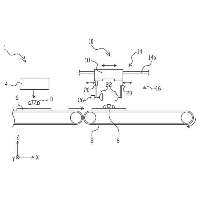 例えば、後工程で加熱処理をする場合、被載置物の姿勢状態によって、被載置物の焼き上がりの見た目にばらつきが生じる。具体的には、ロールパンのように巻き終わり(所謂、巻尻)があるパン生地の場合、パン生地が生地供給装置から天板に移送された結果、天板上方に向けて巻尻が位置する姿勢状態で、パン生地が天板に載置されることがある。この姿勢状態のままオーブンで焼成されると、巻尻周辺において焼きムラが生じ易く、焼き上がりの見た目が良いとは言えない。一方で、天板の載置面に向けて巻尻が位置する姿勢状態で、オーブンで焼成されると、巻尻周辺において焼きムラは生じ難い。このように、被載置物の姿勢状態によって、後工程で品質にばらつきが生じ得る。