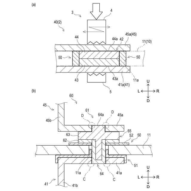 しかしながら、特許文献1に記載の発明のように、かしめ加工や溶接により部材同士を接合した場合は、部材同士が線状に接するため、部材同士の接触面積、ひいては電気を導通させるための面積が比較的小さくなることが想定される。このため、電気エネルギーの損失が発生する可能性がある。
