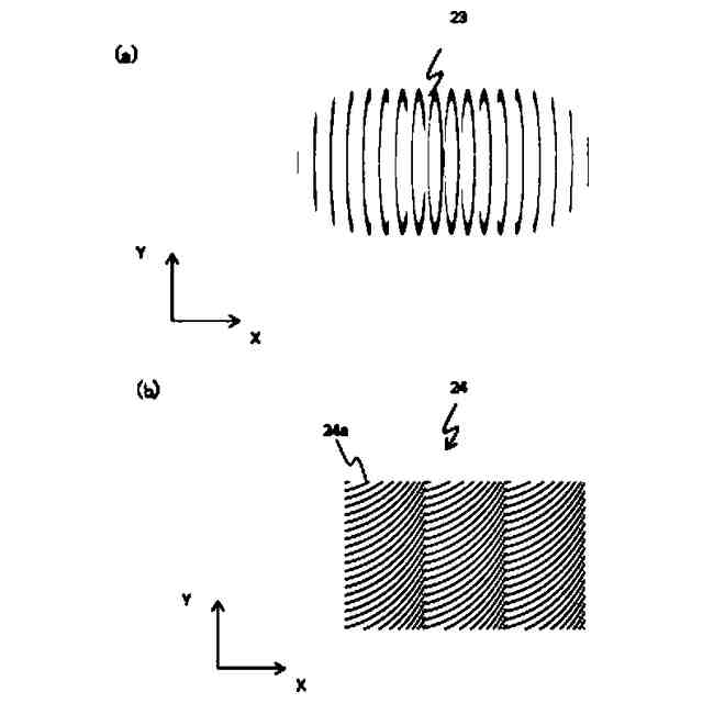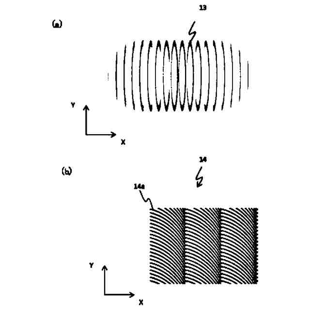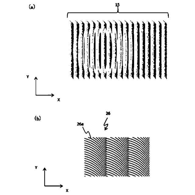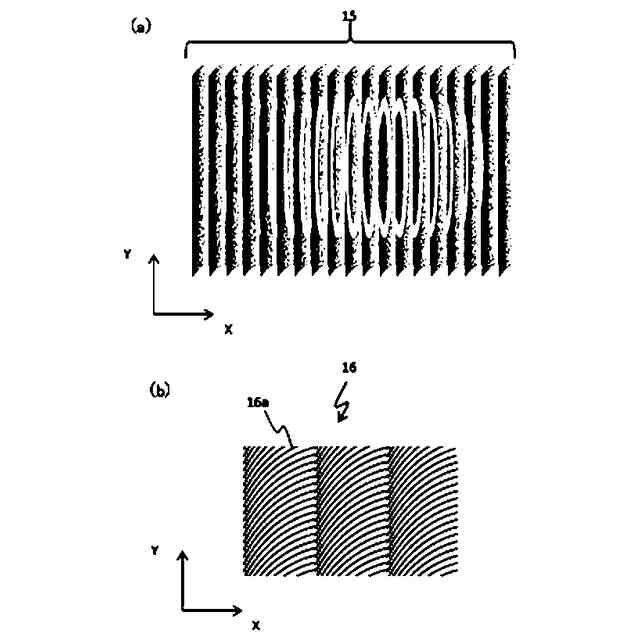 図14は、ネガ型の潜像物の構造例を示す図である。図14に示す潜像物では、円形の基画像を分割圧縮したIP画像140が形成される。また、IP画像140の背景画像141には、基材上に回折格子が形成される。