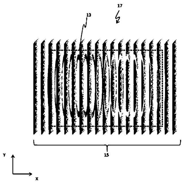 図13は、一般的なIP画像方式の潜像の形成方法の一例を示す図である。図13に示すIP画像方式では、まず、一定の幅を有するフレームを使って基画像121を複数の分割画像に分割する。続いて、各分割画像を水平方向に圧縮して複数の分割圧縮画像122を形成する。このとき、複数の分割圧縮画像122は、所定のピッチP1で一列に並べられる。これらの分割圧縮画像122を、ピッチP1と同じピッチの縞模様(スリット)が形成されたサンプリング器具(不図示)でサンプリングすると、潜像123が出現する。