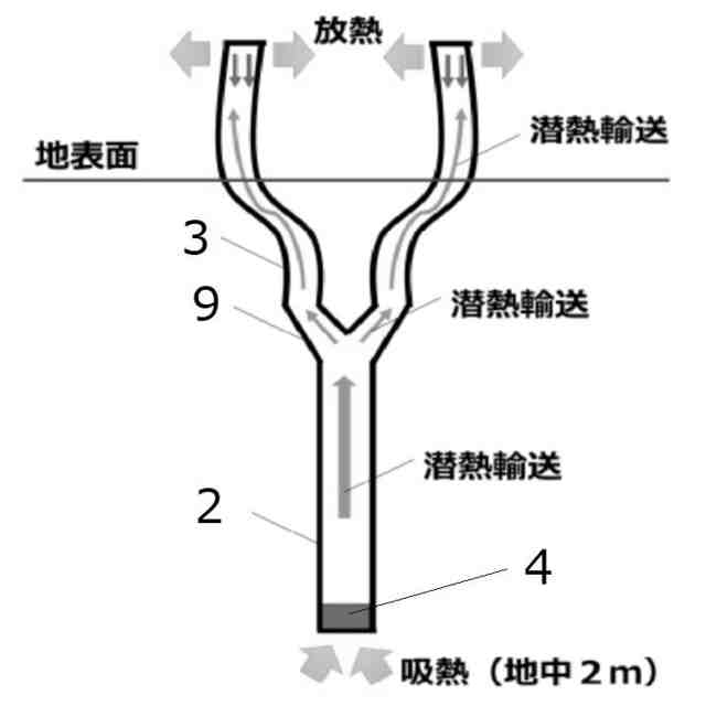 【課題】従来のヒートパイプは、ヒートパイプ間における熱の移動形態が熱伝導による大きな熱抵抗が発生し、下層(地中)から表層(地上)への熱移動量が抑制されていた。