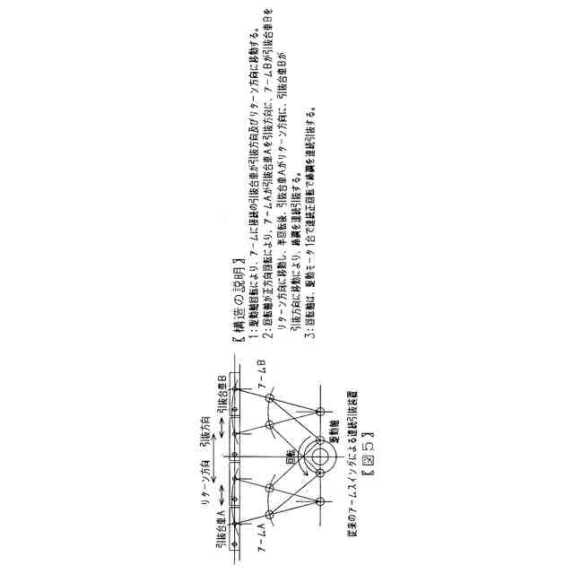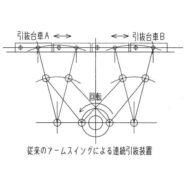 ドラム巻き棒鋼の圧延素材の連続引抜装置において、従来のドラム式及びアームスイング式は、ストローク当たりの引抜長さに制限が有り、共にモータ1台での駆動のため、引抜力の制限がある。本発明はこの課題を解決するためになされたものである。