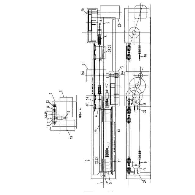 図1の平面図、正面側面図及び断面A-Aにおいて、引抜台車A5の駆動装置に、駆動モータA21、減速機A19、引抜スプロケットA15、引抜ローラチエーンA7 リターンローラチエーンA9、LHガイドA11、LHレールA13、リターンスプロケットA17、チエーン張り処置A27を配置する。引抜磨材2を引抜くための引抜グリッパA23及びグリッパ開閉装置A25を引抜台車本体に取り付ける。