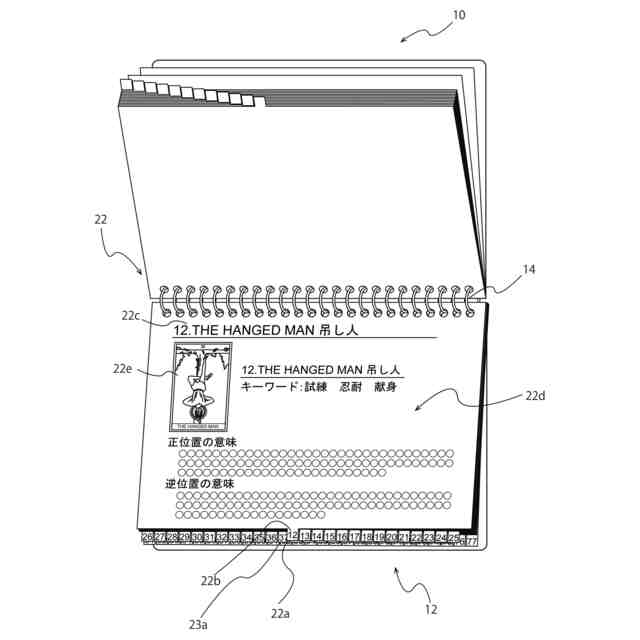【解決手段】カードデッキを構成する少なくとも78枚のタロットカードの意味について説明したタロットカード解説書であって、前記カードデッキを構成する所定のタロットカードのそれぞれに対応する所定のページを有し、前記所定のページは、対応する前記所定のタロットカードをそれのみで特定できる固有番号を表記しており小口部分に形成されるインデックスと、前記固有番号により特定される前記所定のタロットカードの占いにおける意味の解説を表記した解説表記部と、と有するタロットカード解説書。