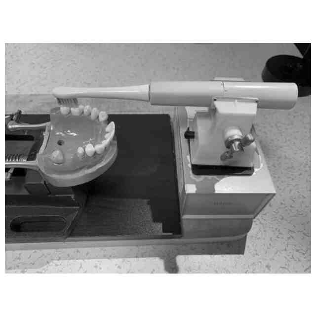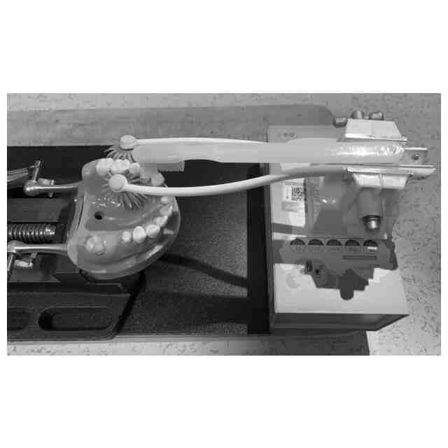 歯ブラシの角度の調整を可能にした実験装置を示した。