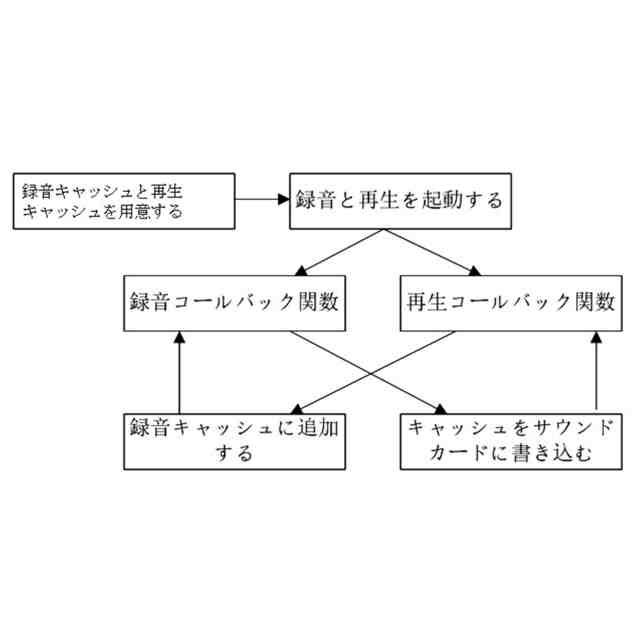 録音コールバック関数において、N個の再生キャッシュキューにおける符号iのキャッシュをサウンドカードに書き込み、iを0から1だけインクリメントし、iがNに等しければ0にリセットする。