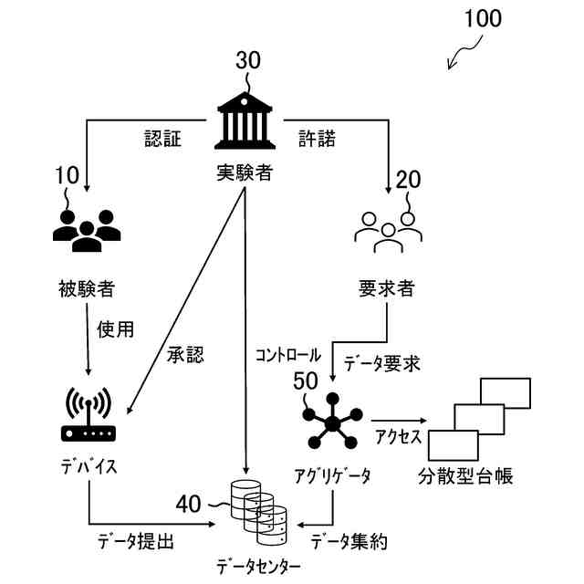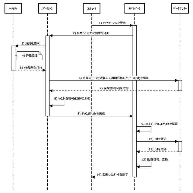 発明の詳細な説明【技術分野】 【0001】 本発明は、データの真正性、完全性、機密性、秘匿性を確保しつつデータを共有する技術に関し、特に、中央管理者の介在なく、データソースが提供したデータをコンシューマが集約する分散型データアグリゲーションに関する。 続きを表示(約 5,600 文字)【背景技術】 【0002】 データアグリゲーションは、複数のデータソースから情報をまとめるために不可欠なプロセスであり、特にデータ駆動型分散システムにおいて重要な役割を担っている。典型的なデータアグリゲーションモデルは、中央のアグリゲータが複数のデータソースからのデータストリームを共通のインターフェースで管理する中央集権型のアーキテクチャを採用している。このような中央集権型モデルは、一般に、次のような一連の信頼性の前提に依存している。 a1:アグリゲータはデータの真正性(authenticity)と完全性(integrity)を保証するデータソースを信頼する。 a2:データソースはコンシューマの要求に対するアクセス制御の正しさを保証するためにアグリゲータを信頼する。 a3:すべてのアグリゲーションプロトコルにおいてデータの機密性(confidentiality)が保持される。 a4:データソースはコンシューマに対する匿名性(anonymity)を保持する。 【0003】 しかし、このような信頼性の前提を満たすデータアグリゲーションモデルのメカニズムを設計・実装することは、特にゼロトラスト・セキュリティ・モデルを構築する場合に困難である。a1に関して、データソースの信頼性を高めるために監査システムを使用して、アグリゲータにデータ生成から取得までのプロセス全体を監督・監査させて、データソースによるデータ操作の可能性を防ぐことができる。しかし、これらの監査システムは、新しいデータソースを追加するための拡張性がない上、実際問題としてプライバシーを侵害するおそれがある。a2は、アグリゲータが提供するアクセス制御メカニズムに依存しており、単一障害点攻撃やサービス拒否(DoS)攻撃など、集中型システムに広く存在する脆弱性や脅威に直面している。a3は、データの暗号化により理論的には成立するものの、鍵の交換や管理に課題があり、データ漏洩の可能性もある。さらに、a4は、信頼の確立が双方向の認証(authenticate)とID証明に依存するため、a1、a2と矛盾する可能性が高い。このように、中央集権型のデータアグリゲーションは、データの真正性、完全性、機密性、匿名性といったセキュリティーおよびプライバシー上の重大な課題に直面している。 【0004】 近年、ブロックチェーンに代表される分散型台帳技術の進歩により、中央管理者を置かない分散型データアグリゲーションが可能になった(例えば、非特許文献1ないし7を参照)。分散型データアグリゲーションでは、中央集権型アーキテクチャのアグリゲータを分散化し、ネットワーク上の任意のノード群によって制御することができる。これらのノードは、PoW(Proof of Work)、PBFT(Practical Byzantine Fault Tolerance)、Raftなどの合意メカニズムを通じてアグリゲータの実行結果に同意する。データソースとコンシューマは、アグリゲータの中央集権型管理とは別に、到達可能なノードを介してデータアグリゲーション処理に参加する。 【先行技術文献】 【非特許文献】 【0005】 Y. Ding and H. Sato, “Dagbase: A Decentralized Database Platform Using DAG-Based Consensus,” in 2020 IEEE 44th Annual Computers, Software, and Applications Conference (COMPSAC). Madrid, Spain: IEEE, 2020, pp. 798-807. Y. Hu, S. Kumar, and R. A. Popa, “Ghostor: Toward a Secure {Data-Sharing} System from Decentralized Trust,” in 17th USENIX Symposium on Networked Systems Design and Implementation (NSDI 20), 2020, pp. 851-877. Y. Ding and H. Sato, “Derepo: A Distributed Privacy-Preserving Data Repository with Decentralized Access Control for Smart Health,” in 2020 7th IEEE International Conference on Cyber Security and Cloud Computing (CSCloud)/2020 6th IEEE International Conference on Edge Computing and Scalable Cloud (EdgeCom). IEEE, 2020, pp. 29-35. V.-H. Hoang, E. Lehtihet, and Y. Ghamri-Doudane, “Privacy-preserving blockchain-based data sharing platform for decentralized storage systems,” in 2020 IFIP Networking conference (networking). IEEE, 2020, pp. 280-288. Y. Ding and H. Sato, “Sunspot: A Decentralized Framework Enabling Privacy for Authorizable Data Sharing on Transparent Public Blockchains,” in International Conference on Algorithms and Architectures for Parallel Processing. Springer, 2021, pp. 693-709. Y. Ding and H. Sato, “Self-Sovereign Identity as a Service: Architecture in Practice,” in 2022 IEEE 46th Annual Computers, Software, and Applications Conference (COMPSAC). 2022, pp. 1536-1543. Y. Ding and H. Sato, “Bloccess: Enabling Fine-Grained Access Control Based on Blockchain,” Journal of Network and Systems Management, vol. 31, no. 1, pp. 1-34, 2023. 【発明の概要】 【発明が解決しようとする課題】 【0006】 しかし、ブロックチェーンベースのシステムは、特にID管理に関する問題に依然として直面している。パーミッションレス・ブロックチェーンは、許可なくノードやユーザーとして分散型ネットワークに参加することができる