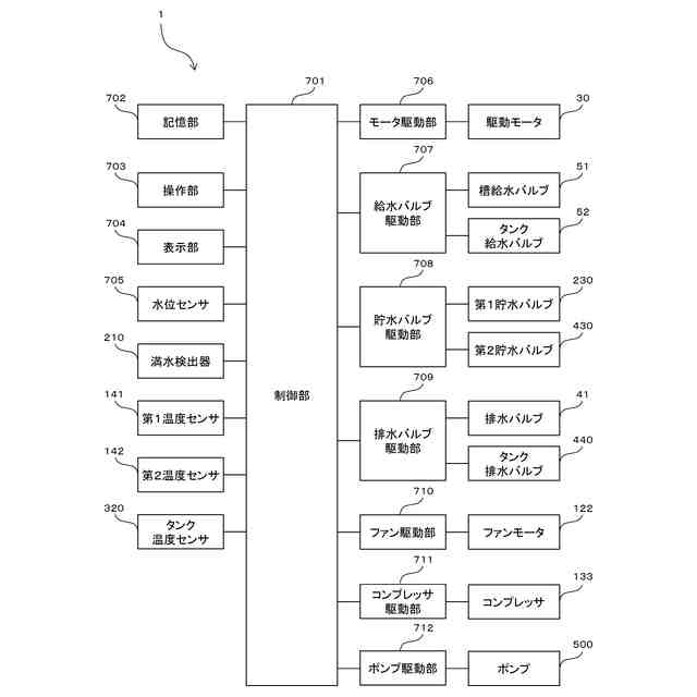 前記制御部は、前記乾燥装置による乾燥時に前記第1タンク内が貯水状態となるよう、前記給水部により前記第1タンク内に給水を行う、