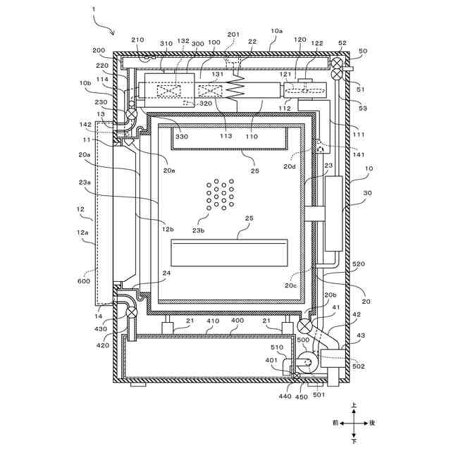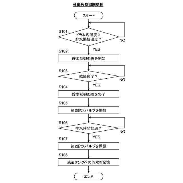 上記特許文献1の洗濯乾燥機では、乾燥運転時に貯水タンク内に貯水されない。また、乾燥運転時に貯水タンク内に貯水されたとしても、ヒータ等の熱源は貯水タンクの上にあり、熱源からの熱は上昇して筐体の上部にこもりやすいので、貯水タンク内の水の吸熱により筐体の外部への放熱を抑制する効果は、ほぼ期待できない。