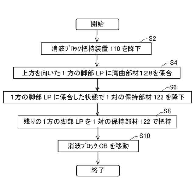 該保持機構は、該ブラケットに回動可能に支持され、互いの先端部が接近することで、前記2つの脚部のうちの1方の脚部を把持可能な1対の保持部材と、該ブラケットを貫通し該1対の保持部材の上端部それぞれに端部が接続され、該1対の保持部材をそれぞれ回動駆動させる直動機構と、を備え、前記係合部材は、該ブラケットに両端部が取付られることで形成されるリングの内径が前記脚部の最小外径以上とされる湾曲部材と、該湾曲部材に固定され前記1対の保持部材の先端部側に延在し、前記消波ブロックを支持可能な支持部材と、を備え、