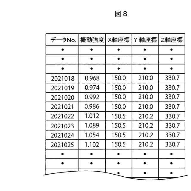 CPUモジュールに記憶されたX軸、Y軸、及びZ軸の各座標値とデータロガーに記憶された振動センサの検出値とを関係付ける関係付け処理を行った結果の一例を表形式で示す説明図である。