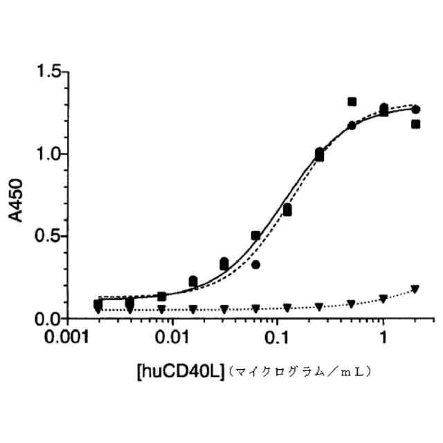 JB5抗体(円、破線)、hu5c8抗体(正方形-実線)、及び対照CTLA4-IgG1(三角形)の、ヒトCD40Lに対する相対的結合を示すグラフである。