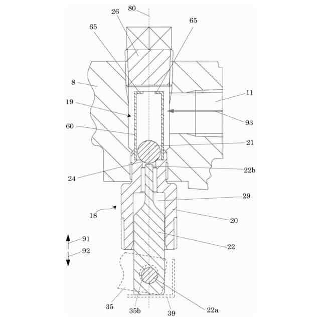 給気弁18の弁ケース20には、作動流体導入口11に連通する貫通孔が軸方向に形成されており、貫通孔の上部に位置する給気弁口24は、給気弁体21の上下移動によって開閉する。弁ケース20の略中央には、4方向に向けて開口25が形成されており、開口25は軸方向の貫通孔に連通している。給気弁体21は円筒形フィルター23内に配置されており、円筒形フィルター23の内面に案内されて上下移動する。