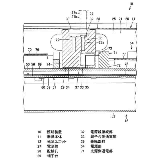 【解決手段】器具本体11は、電源線27が挿通される配線孔28を有する。端子台29は、器具本体11に対向する一面側に設けられ、配線孔28を挿通する電源線27が電気的に接続される電源線接続部32と、反対の他面側に設けられ、電源線接続部32と電気的に接続されている端子台側通電部33とを有する。端子台29は、電源線接続部32が配線孔28に対向する状態で器具本体11に取り付けられる。電源部54は、光源ユニット12に設けられ、電源線27によって供給される電力を変換して光源ユニット12に供給する。光源側通電部71は、光源ユニット12に設けられ、電源部54に電気的に接続されているとともに、器具本体11への光源ユニット12の取り付けにより端子台29の端子台側通電部33に電気的に接続される。