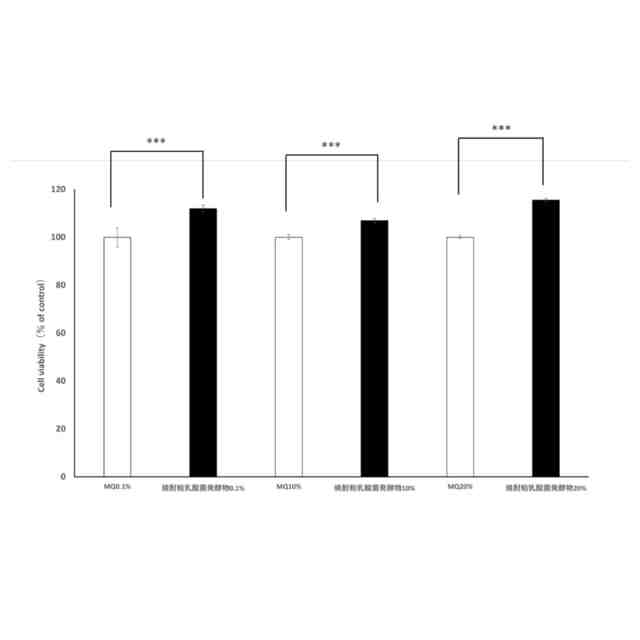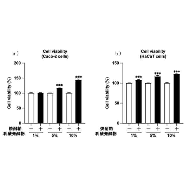 焼酎粕乳酸発酵物のCaco-2細胞及びHaCaT細胞生存率に対する作用を示す。