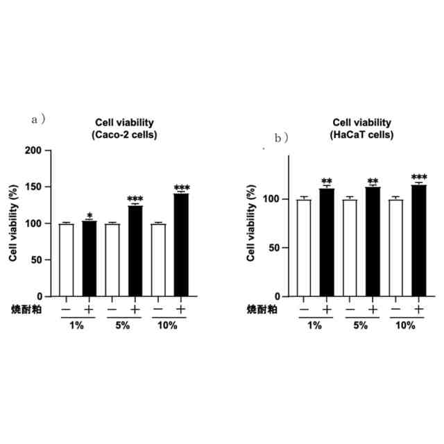 焼酎粕のCaco-2細胞及びHaCaT細胞生存率に対する作用を示す。