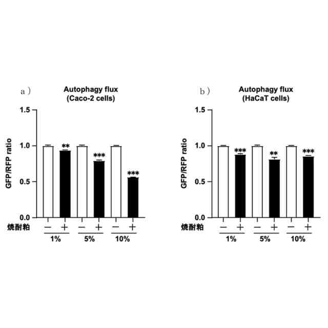 焼酎粕のCaco-2細胞及びHaCaT細胞に対するオートファジー活性化作用を示す。