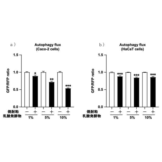 焼酎粕乳酸発酵物のCaco-2細胞及びHaCaT細胞に対するオートファジー活性化作用を示す。