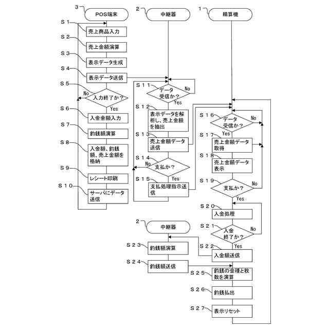 【解決手段】店舗内に配置されたPOS端末3と精算機1とを中継器2を介して接続する。POS端末3は、入力と表示を行う第1操作パネルを備え、商品を登録し、売上額を表示し、中継器2に売上額を出力することができる。中継器2は、入力と表示を行う第2操作パネルを備え、POS端末3から取得した売上額と精算機1から取得した入金額を表示し、第2操作パネルからの所定の入力に応じて所定の精算処理の開始の指示を精算機1に出力することができる。精算機1は、入金額を中継器2に出力でき、また、精算処理の開始の指示を中継器2から取得した場合に、所定の精算処理を開始する。