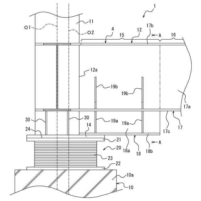 例えばオフィスビルなどの建物の構造として、地盤に接する基礎などの下部構造体に免震装置を設置し、建物の躯体を構成する柱を免震装置の上面に取り付けることで、建物の柱と梁とを含む上部構造体が免震装置により免震されるようにした免震構造のものが知られている(例えば特許文献1参照)。