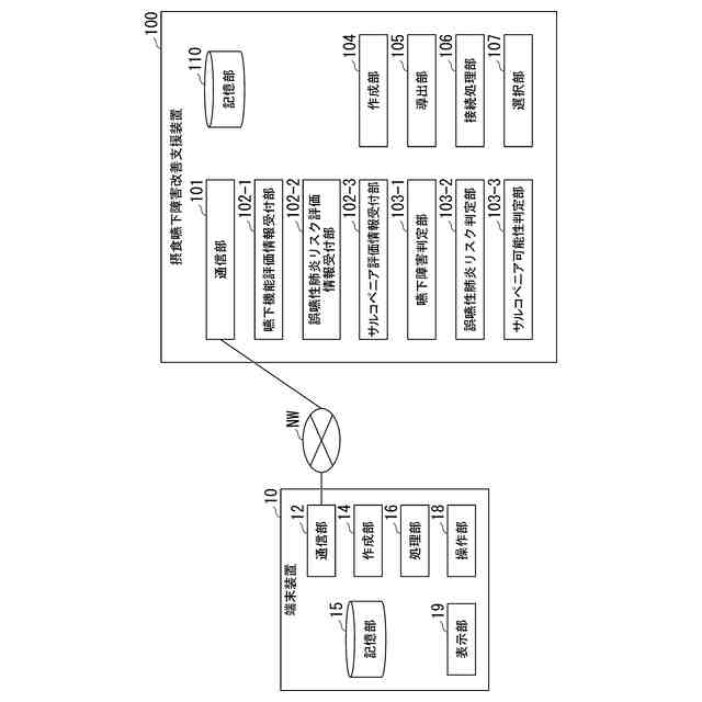 (1)第1の態様に係る摂食嚥下障害改善支援システムは、嚥下機能を評価するための嚥下機能評価情報を受け付ける嚥下機能評価情報受付部と、誤嚥性肺炎リスクを評価するための誤嚥性肺炎リスク評価情報を受け付ける誤嚥性肺炎リスク評価情報受付部と、サルコペニアを評価するためのサルコペニア評価情報を受け付けるサルコペニア評価情報受付部と、前記嚥下機能評価情報に基づいて嚥下障害があるか否かを判定する嚥下障害判定部と、前記誤嚥性肺炎リスク評価情報に基づいて誤嚥性肺炎リスクがあるか否かを判定する誤嚥性肺炎リスク判定部と、前記サルコペニア評価情報に基づいてサルコペニアの可能性があるか否かを判定するサルコペニア可能性判定部と、前記嚥下障害判定部による嚥下障害があるか否かの判定結果、誤嚥性肺炎リスク判定部による誤嚥性肺炎リスクがあるか否かの判定結果および前記サルコペニア可能性判定部によるサルコペニアの可能性があるか否かの判定結果に基づいて、摂食嚥下障害を改善する対応を導出する導出部とを備える、摂食嚥下障害改善支援システムである。