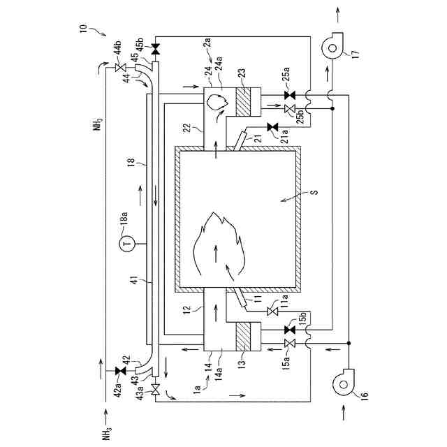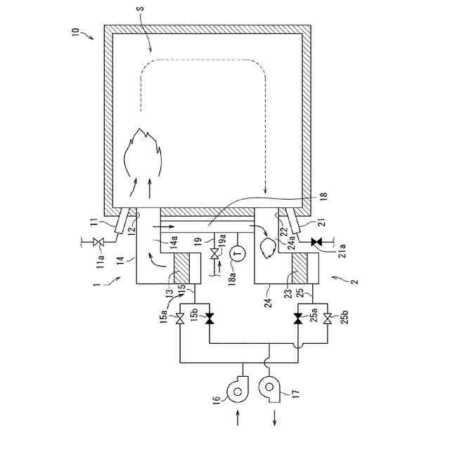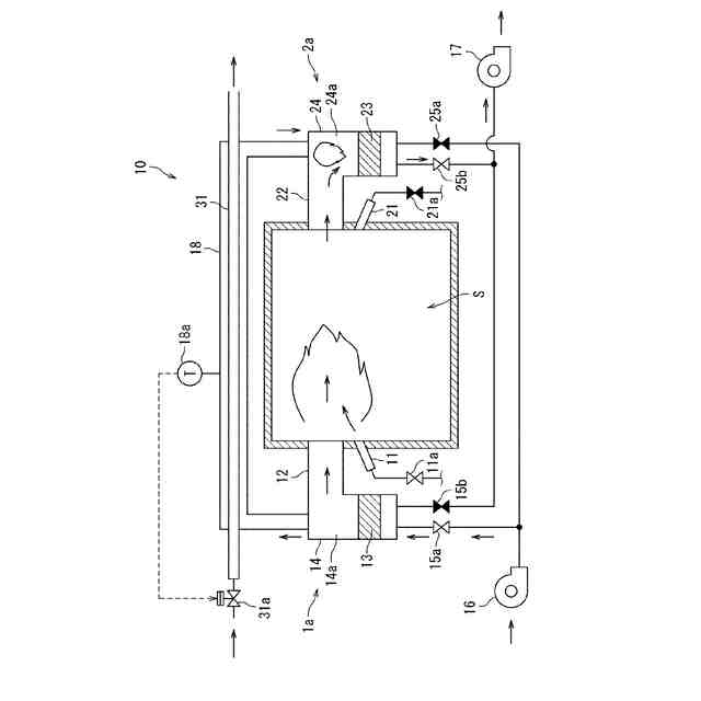 図1は、本発明の第1実施形態に係るリジェネバーナ装置10の断面概略図である。図1に示されるように、リジェネバーナ装置10は、炉内Sにおいて1つの壁面に並んで位置する一対のバーナ1、2を備えている。なお、一対のバーナ1、2は、炉内Sにおいて互いに対向するように、対向する壁面に1つずつ配置されていてもよい。