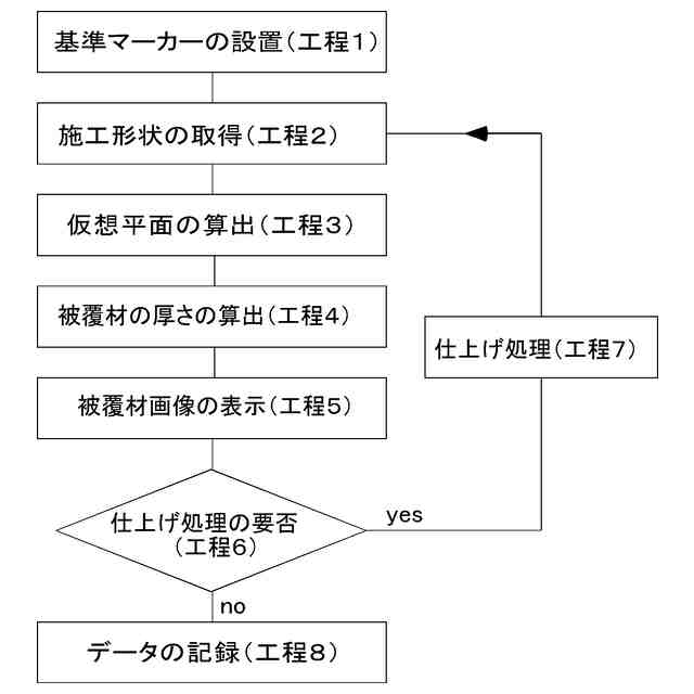 【解決手段】基準マーカーを設置する工程(工程1)と、被覆材の表面の三次元座標および3点以上の基準三次元座標を含む施工形状を取得する工程(工程2)と、仮想平面を施工形状内に算出する工程(工程3)と、被覆材の厚さを算出する工程(工程4)と、被覆材画像を表示する工程(工程5)とを有する被覆材の厚さ計測方法。