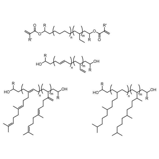 及びそれらの組合せにより表される構造からなる群から選択され、式中、n及びmは0~40の範囲内の整数であり、n+m≧1であり、構造中のヒドロキシル基の任意の1つ又は複数はエステル化されて、アクリレートアナログを形成してもよく、Rは炭化水素ラジカルであり、R’は水素又はメチルである。
