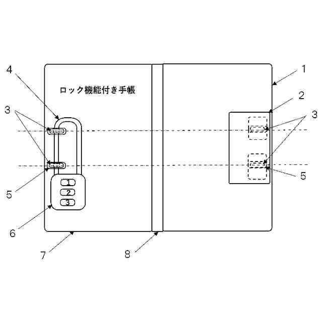 図1はダイヤル式南京錠を利用したロック機能付き手帳を開いた時の外側からの正面図