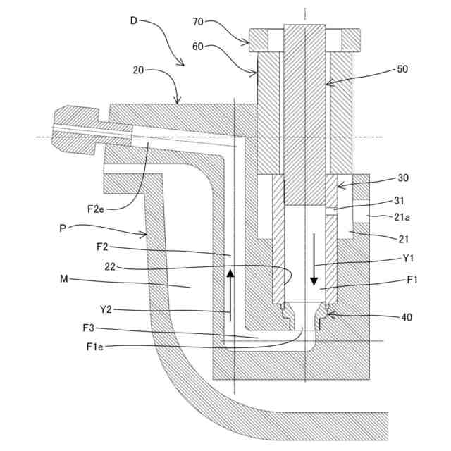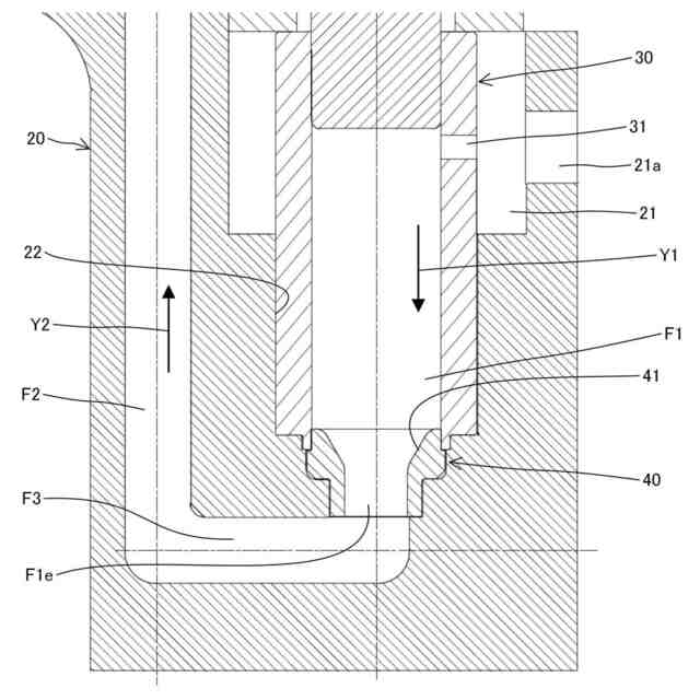 前記スリーブは、前記流入口が形成され内径がほぼ一定に形成された略筒状の第一スリーブと、前記第一流路の流出端側に位置し前記第一スリーブの端部に連結された略筒状の第二スリーブと、により構成されている、