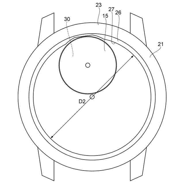 裏蓋側から見た、地板と香箱との構造を示す平面図。