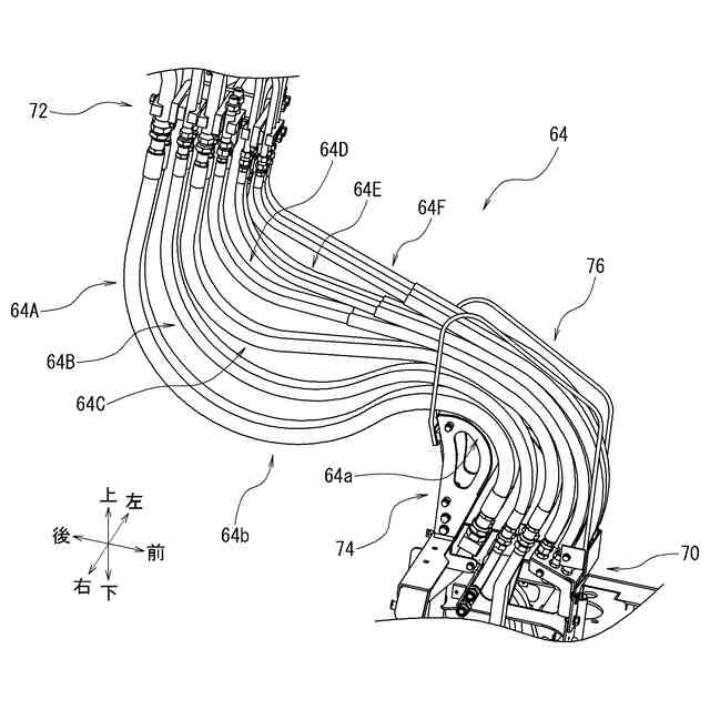 上部体には、油圧ポンプを駆動するエンジンが搭載され、当該油圧ポンプから吐出される圧油は、コントロールバルブから油圧配管を通じて作業装置の油圧シリンダに供給される。油圧配管の構成要素として、一定の曲率まで湾曲させて用いることができる油圧ホースが広く採用されている(特許文献1:特開2019-007254号公報参照)。