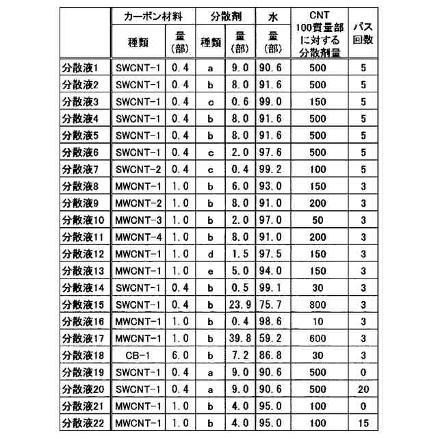 関連する従来技術としては、例えば、平均外径が3nm以下であるCNTと分散剤を含んだ分散体であって、動的光散乱法によって測定した平均粒径が200nm以上1500nm以下であることを特徴とするCNT水性分散液、並びに分散液を乾燥して得た塗膜の表面抵抗を測定してCNTの導電性を評価する方法が提案されている(特許文献1)。