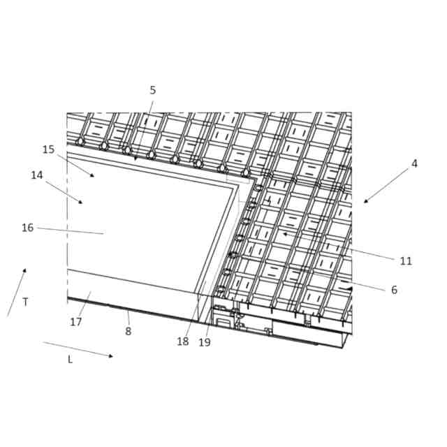 前記天井壁(4)の前記二次密閉メンブレン(9)は前記後部横方向縁部(49)と前記後部コファダム壁(82)との間に、前記長手方向に延在すると共に前記後部横方向縁部(49)によって途切れている複数の平行な第1のストレーキ(64)を備えており、