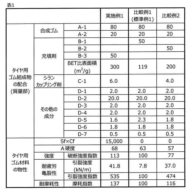従来から、補強性充填剤としては、カーボンブラックが使用されている。これは、カーボンブラックがタイヤ用ゴム材料に高い耐摩耗性を付与し得るからである。しかしながら、カーボンブラックの単独使用で、ウェットグリップ性、耐摩耗性、低燃費性が高いレベルでバランスしたタイヤ用ゴム材料を得ることは困難である。このような問題に対して、カーボンブラックの代わりに湿式シリカを配合することが行われている。しかしながら、湿式シリカを充填剤として用いた場合、カーボンブラックの配合量が相対的に減少するため、タイヤ用ゴム材料の破壊強度、耐摩耗性の低下が免れないことが知られている。また、湿式シリカはゴムへの分散性が悪く、混練を行う際のタイヤ用ゴム材料のムーニー粘度が高くなり、押出し成形による加工性に劣るという問題がある。