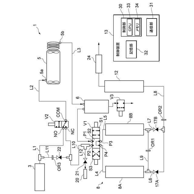前記一方の吸着部へ前記加圧気体を供給している期間において、前記吸気電磁弁を制御して、前記第二ラインと前記循環ラインとを接続している状態から、前記第二ラインと前記第一ラインとを接続する状態へ切り替える、