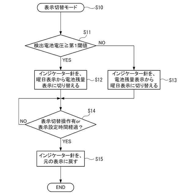 特許文献1の電子時計では、通常時に曜日を指示する曜日針は、ユーザーがボタン操作を行った場合に電池残量を指示するため、ユーザーがボタン操作を行わない限り、電池残量を表示することができなかった。