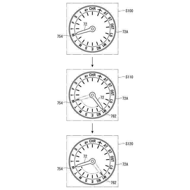 第3小針73は、1/20秒クロノグラフ針である。第4小針74は、第1小針71が指示するホームタイムが午前/午後のいずれであるかを示すAM/PM針である。
