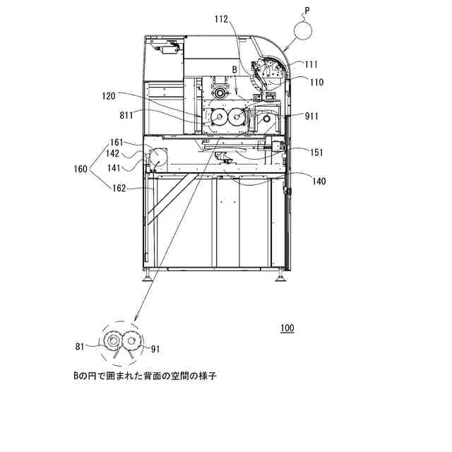 空容器回収装置100は、待機時、物品投入部の外扉111が閉状態であり、容器投入部110と袋保持部140の間に開閉自在に設けられた内扉112が閉状態である。袋保持部140は、空容器を回収するために用いられる袋(ビニール袋)を保持するものであって、収容部として機能する。そして、後述するように、空容器回収箱といった特別な専用付属品を必要としない。ただし、空容器回収箱を用いる態様が排除されるものではない。物品回収時に、容器投入部110の外扉111が開状態となり、判別部により、容器投入部110の載置部へ載置された物が回収対象物の物品(例えば、PETボトル等の樹脂製の空容器)であるか否かが判別される。回収対象物の物品(空容器)であると判別された場合、外扉111が閉状態となり、容器投入部110と袋保持部140(本実施形態においては、袋保持部140は2つ備えられている。)の間に設けられた内扉112が開状態となり、袋保持部140に保持された袋に容器が回収される。本実施形態では、空容器回収装置100が減容機構(減容部120又は容器減容部ともいう)を備え、減容機構(減容部120)により容器を減容することで、規定容量の2つの袋(ビニール袋)によって多量の減容された空容器を回収可能である。また、偏向機構151(振分け部)によって、空容器の送出方向を前後左右の様々な方向に異ならせることができるため、回収効率の良い袋交換が可能である。