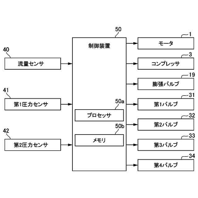 前記第1バルブ、前記第2バルブ及び前記コンプレッサを制御するように構成された制御装置と、