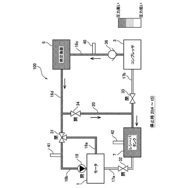 にオイルを含有させた冷媒を圧縮するコンプレッサ3と、ロータ11及びステータ12と、ロータに連結された回転軸13と、回転軸を支持する滑り軸受14とを備え、コンプレッサにより圧縮された冷媒が供給され、滑り軸受が冷媒により潤滑するよう構成されたモータ1と、コンプレッサからモータへと冷媒を供給するための冷媒通路(第1通路)16a~16d、及び、モータからコンプレッサへと冷媒を供給するための冷媒通路(第2通路)17a、17bと、第1通路上に設けられた第1バルブ31及び第2通路上に設けられた第2バルブ32と、車両が停止するときに第1及び第2バルブを閉弁する制御装置50と、を有する。
