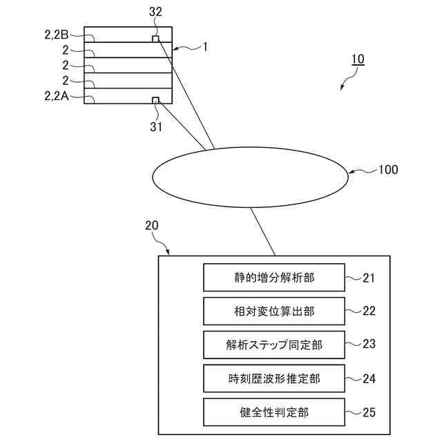【解決手段】建物を模擬した立体骨組モデルを用いて静的増分解析を行い、応答値を算出する、静的増分解析部と、第1センサ及び第2センサと、地震情報から、1階と特定階の間の時刻歴相対変位波形と、当該時刻歴相対変位波形の最大ピーク値である最大相対変位と、を算出する、相対変位算出部と、特定階の1階に対する相対変位との差分が最小となるような解析ステップを、差分最小解析ステップとして同定する、解析ステップ同定部と、差分最小解析ステップでの応答値を基に、パラメータに関する時刻歴波形を推定する、時刻歴波形推定部と、階層及び部材の各々に対し、関連するパラメータの各々に対して推定された時刻歴波形を基に、損傷の程度を評価し、建物の健全性を判定する健全性判定部と、を備えている。