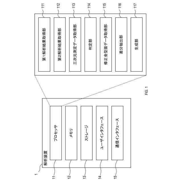 第1解析結果取得部は、スプリングバック解析を含むプレス成形に関するシミュレーションを、第1金型の三次元形状を表す第1金型面データを用いて行うことにより生成される三次元点群データであって、第1金型を用いたプレス成形により得られる第1プレス成形品の見込み形状を表す三次元点群データである第1解析結果データを、取得するように構成される。